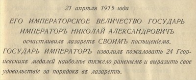 О Высочайшем посещении государем-императором мастерской Тверского отделения Красного Креста и воинского лазарета осталась запись в Отчёте по лазарету Тверскго Губерноского Земства за второе полугодие 1915 года.