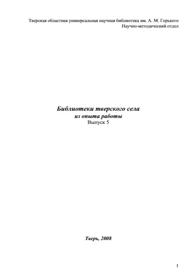 Библиотеки тверского села : из опыта работы / Тверская областная универсальная научная библиотека им. А. М. Горького, Научно-методический отдел ; [составитель Н. Г. Плотникова ; редактор Л. А. Абрамова]. – Текст (визуальный) : электронный. - Вып. 5. - 1 файл : ч/б. - Загл. с экрана. - Оригинал-макет.