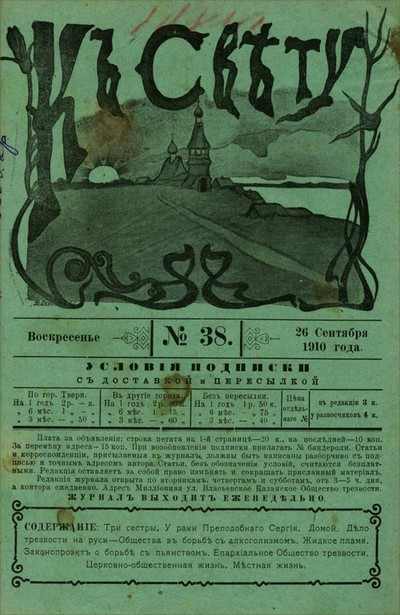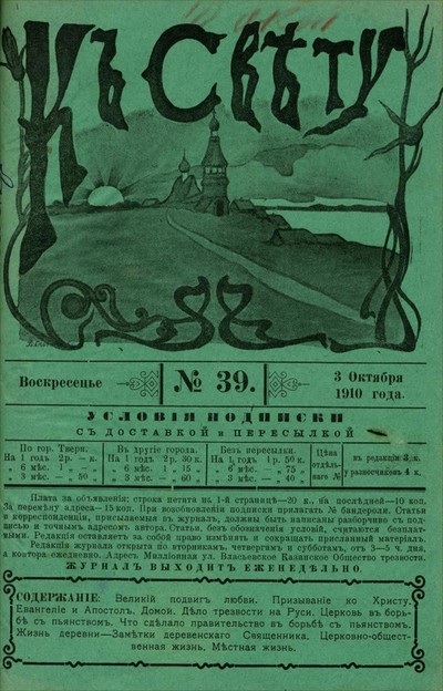 К свету : еженедельный, внепартийный, общественный и литературный журнал, № 14. 2 мая 1910 / [Власьевское Казанское Общество трезвости ; редактор-издатель священник Н. В. Лебедев]. - (Тверь : Тверская ОУНБ, 2023). - Текст (визуальный) : электронный. - Загл. с экрана.