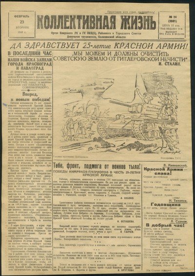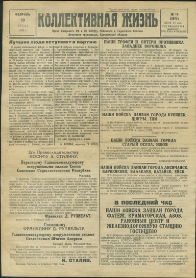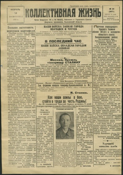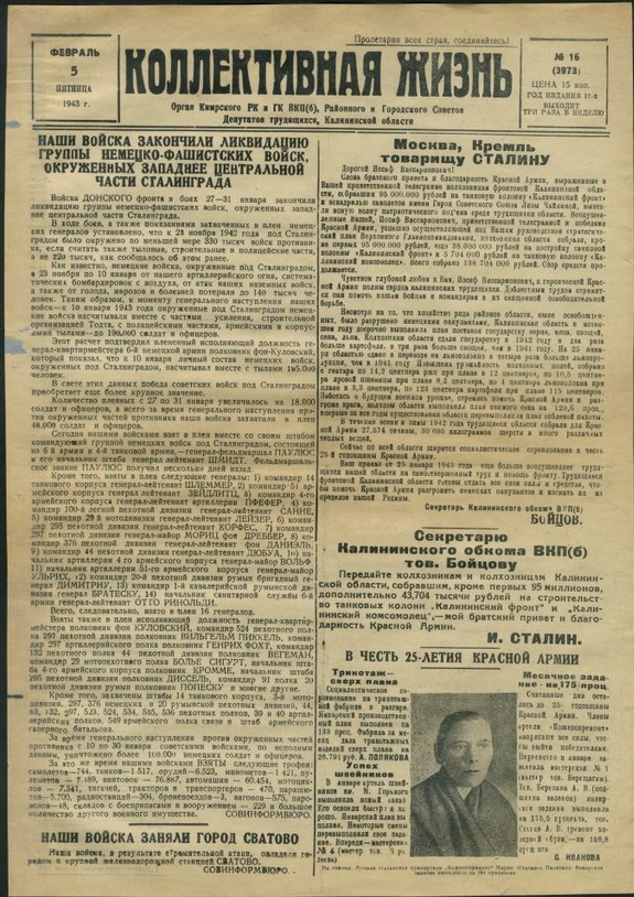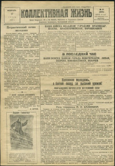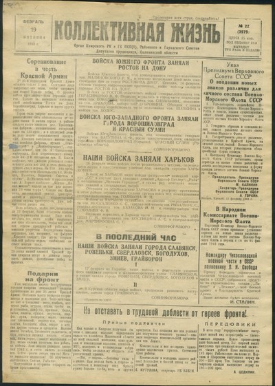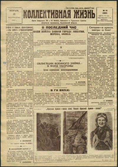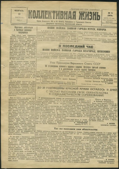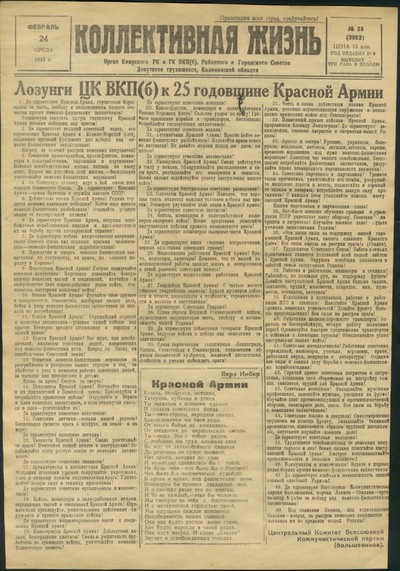 Коллективная жизнь : газета / орган Кимрского РК и ГК ВКП(б), Районного и Городского Советов Депутатов трудящихся, Калининской области ; [ответственный редактор В. С. Шер]. - Кимры : Типография издательства газеты "Коллективная жизнь", 1925 - . - Выходит 3 раза в неделю. - 9000 экз. : 0.15.