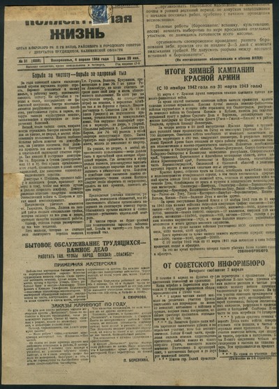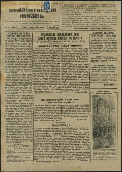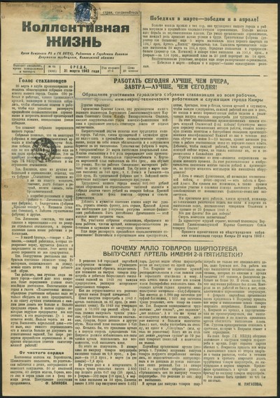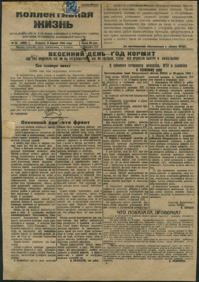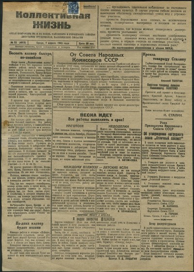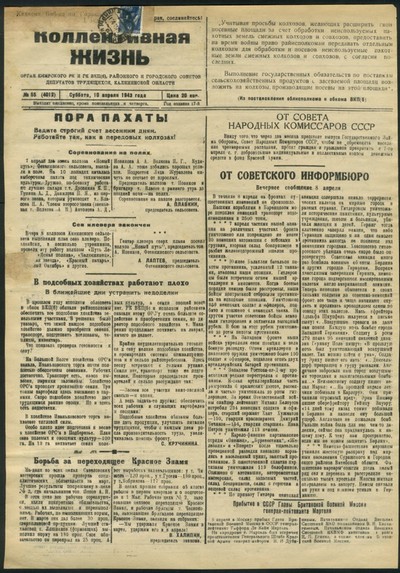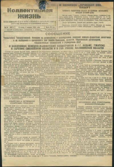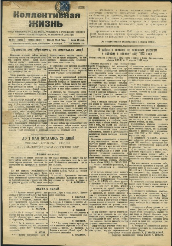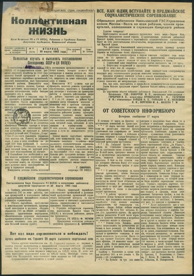 Коллективная жизнь : газета / орган Кимрского РК и ГК ВКП(б), Районного и Городского Советов Депутатов трудящихся, Калининской области ; [ответственный редактор В. С. Шер]. - Кимры : Типография издательства газеты "Коллективная жизнь", 1925 - . - Выходит 3 раза в неделю. - 9000 экз. : 0.15.