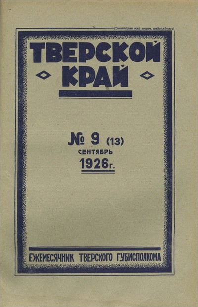 Тверской край : ежемесячный журнал Тверского губернского исполнительного комитета, № 9 (13). Сентябрь 1926 г. / Тверской губернский исполнительный комитет. - Тверь : Тверская ОУНБ, 2026- . – Текст (визуальный) : электронный. - Загл. с экрана.