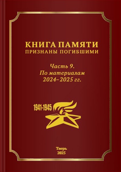 Книга памяти. Признаны погибшими, ч. 9. По материалам 2024-2025 гг. : монография / авторы-составители: В. Г. Щекотилов, И. В. Епишкина, Е. Д. Журенкова [и др.]. - Тверь : Заповедник Времени, 2025. - 243 с. : ил., портр., факс., к. ; 20 см.
