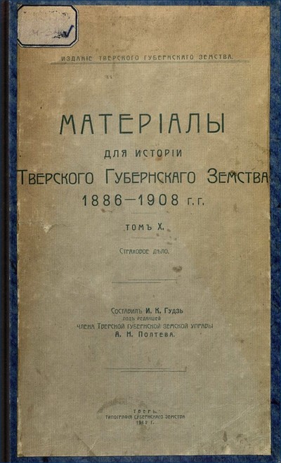 Тверское губернское земство. Материалы для истории Тверского губернского земства : сборник : в 10 т. / Тверское губернское земство. - Тверь : Тверское губернское земство, 1883-1911. - 24 см. - Загл. т. 1-5: Сборник материалов для истории Тверского губернского земства. -  Т. 7 : Продовольственное дело ; Содействие губернского земства поднятию экономического благосостояния населения, развитию промыслов и торговли ; Пути и средства сообщения ; Повинности : 1886-1908 гг. / сост. И.К. Гудзь ; ред. А.Н. Полтев. - 1913. - [5], XIX, 1077 с.
