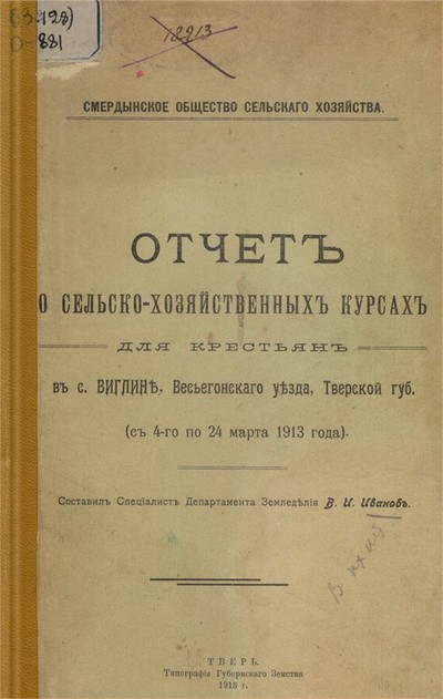 Тверское губернское земство. Сборник материалов для истории Тверского губернского земства / [Тверское губернское земство]. - Тверь, 1883-1911. - 26 см. - Сост.: т. 1-2: Л.Ф. Виноградов; т. 6-10: И.К. Гудзь. - Ред. т. 14: П.А. Корсаков; т. 6-10: А.Н. Полтев. - Загл. т. 6-14: Материалы для истории Тверского губернского земства. - Т. 2, вып. 1: 1866-1882 гг. / составлен Л. Ф. Виноградовым ; под редакцией П. А. Корсакова. - 1884. - III, 560 с. : табл. - С 6-го тома выходит под заглавием: Материалы для истории Тверского губернского земства.