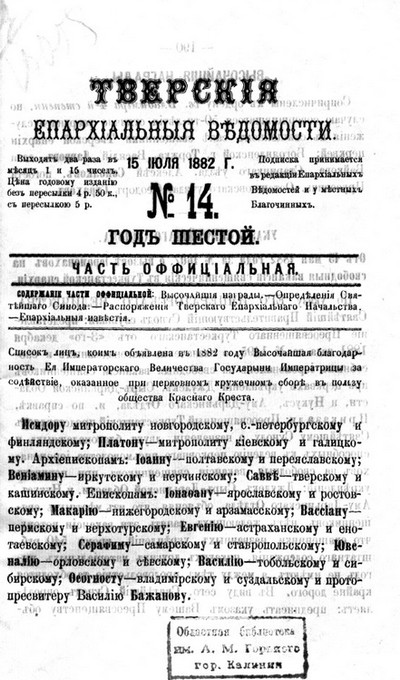 Тверской патерик : краткие сведения о тверских местно чтимых святых. - Издание Церковного историко-археологического общества Казанской епархии. - Казань : Типо-литография Императорского Университета, 1908. - 223, [16] с., [1] л. ил. ; 25 см. - Хронологический и алфавитный указатели в конце книги. - Авт. в кн. не указан; установлен по изд.: Высокопреосвященнейший Димитрий, архиепископ Казанский и Свияжский.