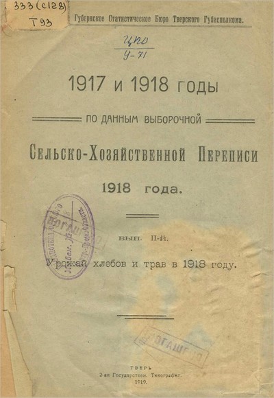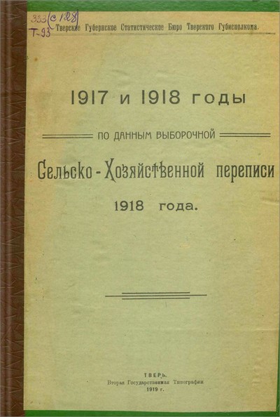 1917 и 1918 годы по данным выборочной сельско-хозяйственной переписи 1918 года / Тверское губернское статистическое бюро Тверского губисполкома. - Тверь : [б. и.], 1919- [Вып. 1]. - 1919. - 48 с. : табл. - Вып. не нумерован.